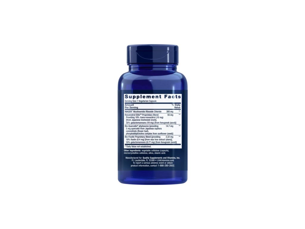 Společnost Life Extension jako jedna z prvních upozornila na úžasné účinky resveratrolu a později i látky NIAGEN – první komerčně dostupné formy nikotinamid ribosidu.Nedávné klinické studie odhalily, že 250 mg nikotinamidového ribosidu vedlo ke 40% zvýšení hladiny NAD+, a že resveratrol pomáhá zvýšit citlivost na inzulín, čímž podporuje zvýšenou funkci mitochondrií a přispívá k udržení normální hladiny cukru v krvi. Kromě toho další studie potvrdily, že resveratol je silný antioxidant, který má protizánětlivé účinky a pomáhá chránit před negativními účinky stravy s vysokým obsahem tuků.