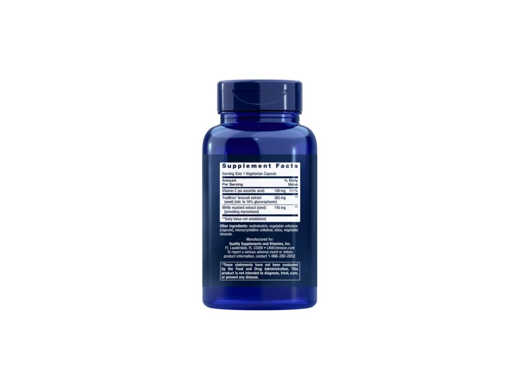 Pomocné látky:Maltodextrin, rostlinná kapsle (celulóza), mikrokrystalická celulóza, oxid křemičitý, rostlinný stearát. TrueBroc® je registrovaná ochranná známka společnosti Brassica Protection Products LLC. *Vitamin C přispívá k ochraně buněk před oxidativním stresem.