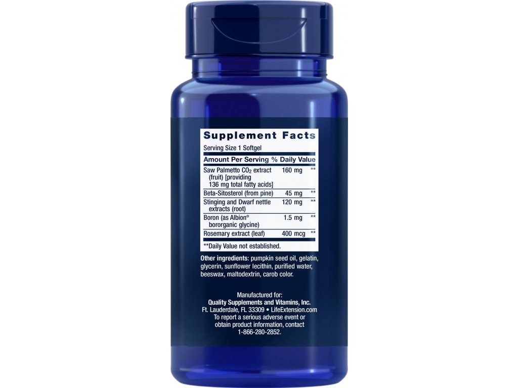 Desítky let výzkumu naznačují, že sloučenina beta-sitosterolu v palmě trpasličí (Saw Palmetto) může pomoci podpořit zdraví mužských močových cest.Publikované studie ukazují, že mnoho mužů během svého života trpí nějakou formou nepohodlí způsobeného prostatou a extrakt z palmy trpasličí se prokázal jako zlatý standard v její přirozené podpoře. Na rozdíl od typických extraktů Life Extension nabízí složení s ultra vysokou účinností.