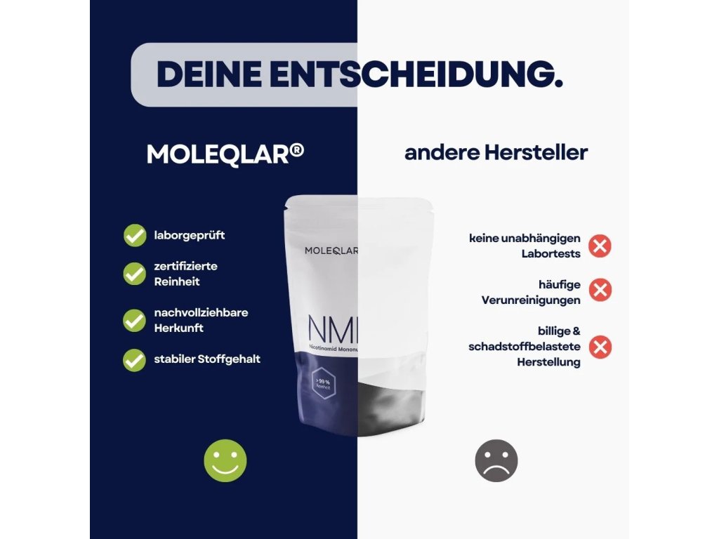 Studie v USA testovala 22 různých poskytovatelů – s ničivými výsledky . Více než polovina nenabízela žádné skutečné NMN nebo pouze podřadné NMN. Nemáme co skrývat! U společnosti MoleQlar se transparentnost nepíše pouze velkými písmeny na začátku věty, ale také pokud jde o kvalitu našich produktů. Každý jeden z našich produktů – samozřejmě včetně NMN – je testován a certifikován na čistotu a těžké kovy jak naším výrobcem, tak nezávislými laboratořemi Arotop společnosti Limbach Analytics v Mohuči v Německu pomocí zlatého standardu h-NMR . Přesvědčte se sami o vynikající kvalitě MoleQlar!Užívání